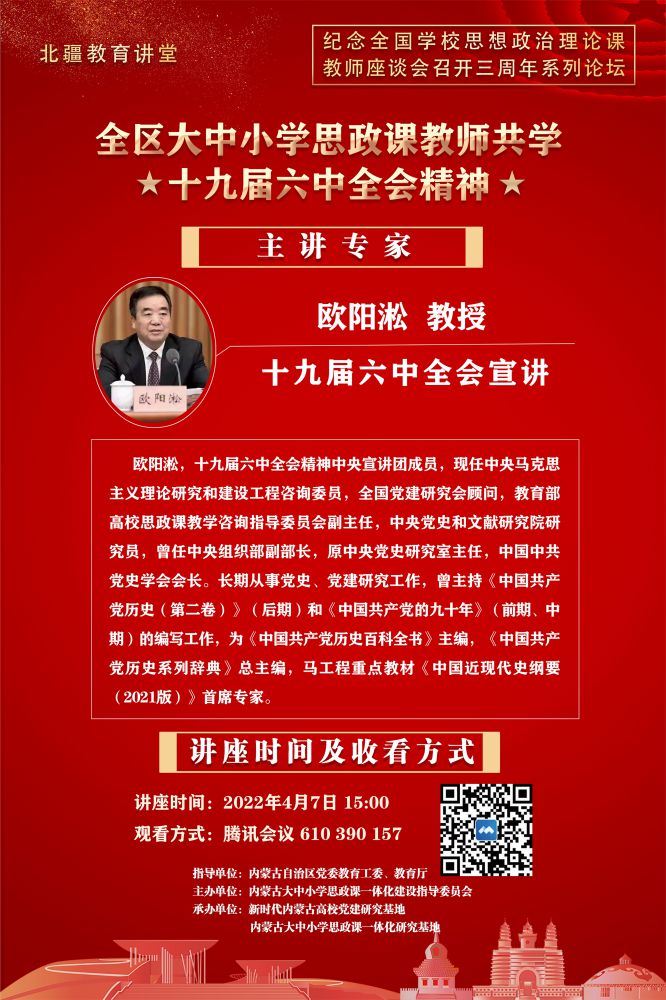 本次讲座自治区教育厅邀请了党的十九届六中全会精神中央宣讲团成员、中央马克思主义理论研究和建设工程咨询委员、全国党建研究会顾问、教育部高校思政课教学咨询指导委员会副主任、中央党史和文献研究院研究员欧阳淞作专题讲座。讲座紧紧围绕学习领会习近平总书记在十九届六中全会上的重要讲话和《决议》精神,从深刻把握召开党的十九届六中全会、作出新的历史《决议》的重大意义;深刻把握党的百年奋斗的初心使命和重大成就;深刻把握中国特色社会主义新时代的历史性成就和历史性变革;深刻把握党的百年奋斗的历史意义和历史经验、走好新的赶考之路等方面,运用丰富史料与详实数据,进行了系统阐述和深入解读。