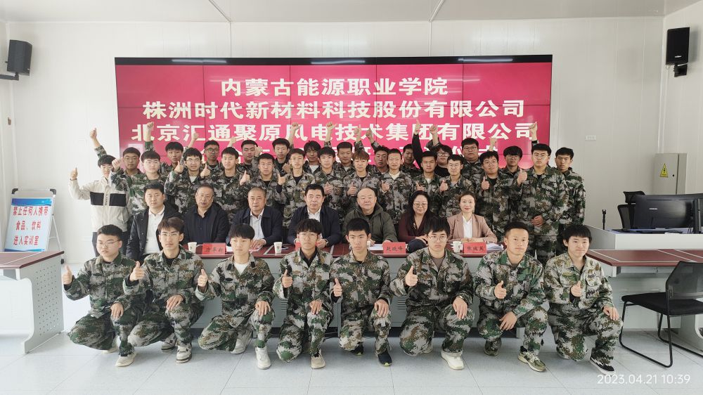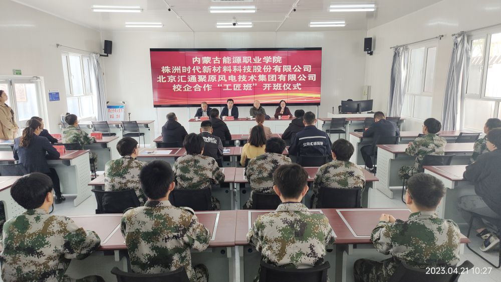2023年4月21日上午,内蒙古能源职业学院同株洲时代新材科技股份有限公司、北京汇通聚原风电技术集团有限公司在学院仿真实训室举行校企合作“工匠班”开班仪式。中车时代新材风电产品事业部蒙西分公司党支部书记唐革新,北京汇通聚原风电技术集团有限公司董事长高海坡,学院院长赵晓峰,学院和两大公司相关部门负责人,风电工匠班同学出席会议。会议由学院副院长张瑞英主持。