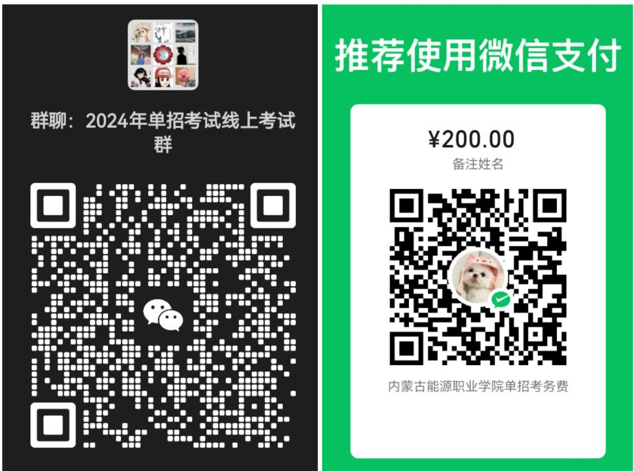 线上考生在完成网上填报志愿后,及时关注“内蒙古能源职院”官方微信,扫码进入微信群缴纳考试费。(缴费后自行放弃考试不予退费)
