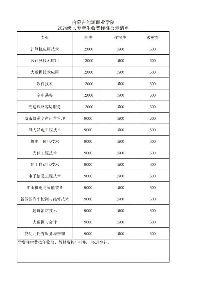 内蒙古能源职业学院2024级大专新生收费标准公示清单-内蒙古能源职业学院