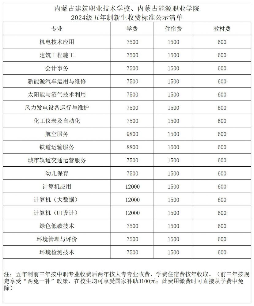 2024级五年制新生收费标准公示清单-内蒙古能源职业学院
