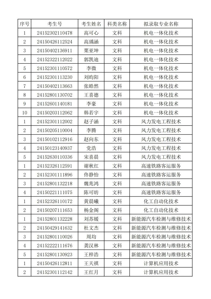 根据《关于做好2024年高等职业院校单独考试招生工作的通知》(内教招考普〔2024〕3号)的文件精神和《内蒙古能源职业学院2024年单独招生实施方案》的工作安排。根据专业志愿清录取原则,2024年单独考试招生工作领导小组对我校2024年单独考试招生录取名单进行审核,经审核,决定对225名考生拟录取,现予以公示。待内蒙古教育招生考试中心审核后,正式录取名单在内蒙古招生考试信息网公布。