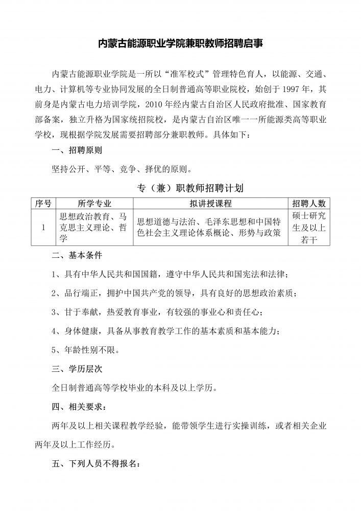 内蒙古能源职业学院兼职教师招聘启事-内蒙古能源职业学院