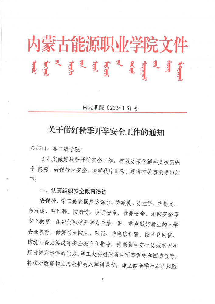 关于做好秋季开学安全工作的通知-内蒙古能源职业学院