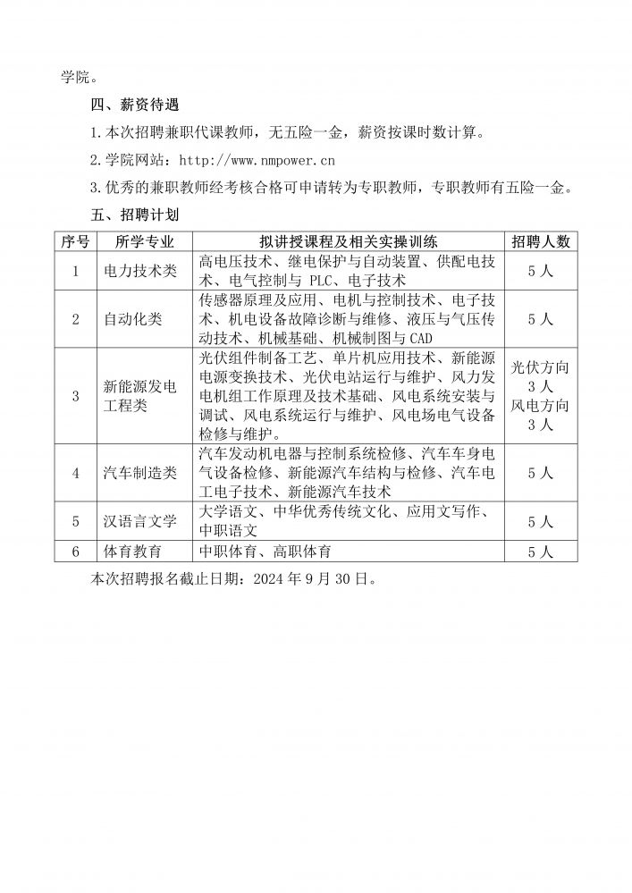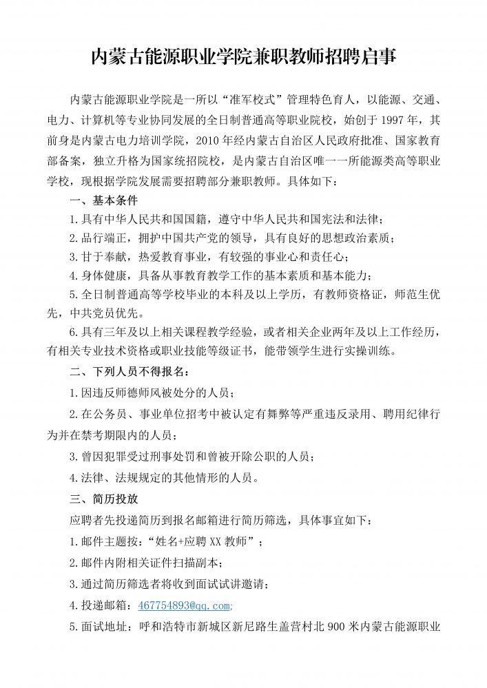 内蒙古能源职业学院兼职教师招聘启事-内蒙古能源职业学院