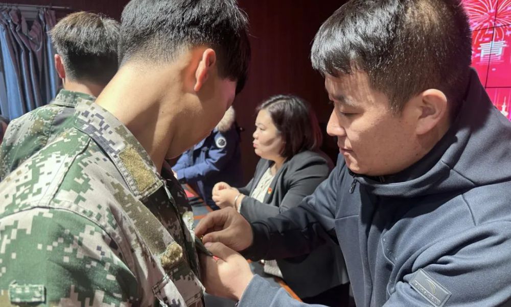 学院党委副书记、副院长白亚楠、团委书记、学生工作部副处长宇文娟、中共党员财务部纪慧敏老师、中共党员学生工作部吴凯英老师、中共党员学生工作部李丰彪老师为新团员颁发团员证、佩戴团徽。团徽是共青团员身份的象征,是承载着责任和使命,提醒着青年团员时刻牢记自己的团员身份。新团员们接过的不仅仅是一枚团徽,更是代代相承的红色理想与信念。
