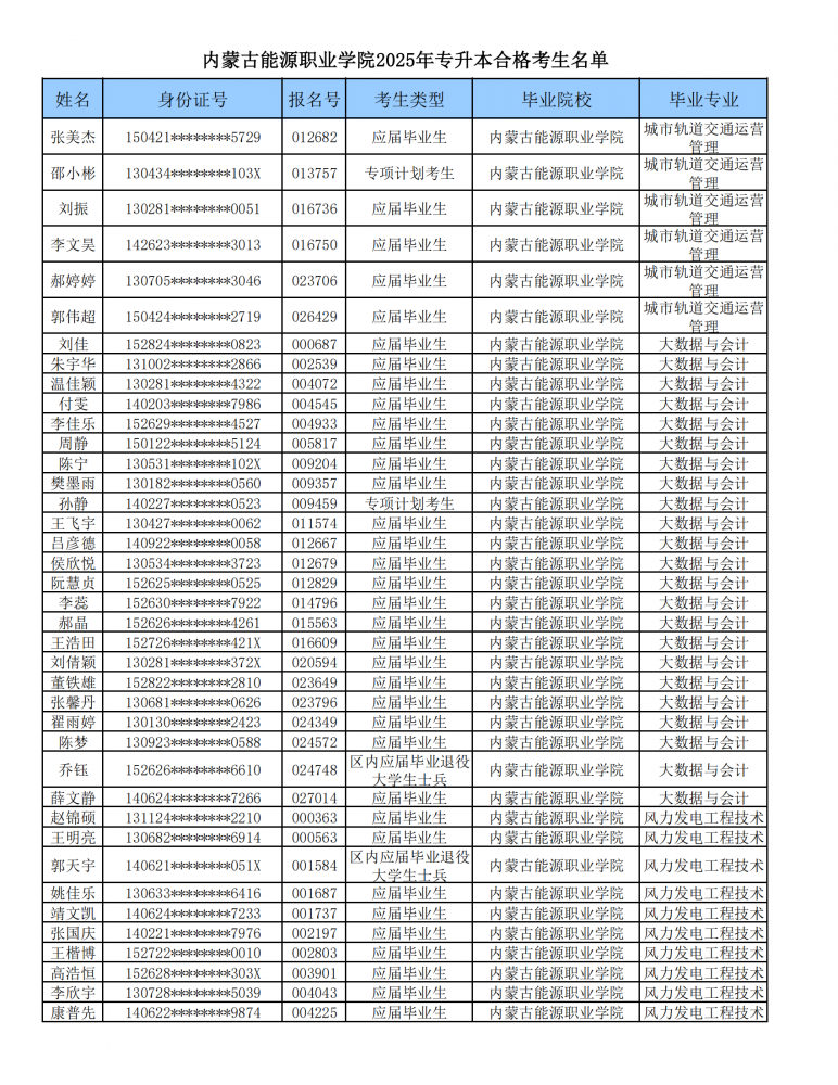 内蒙古能源职业学院2025年专升本合格考生名单公示
