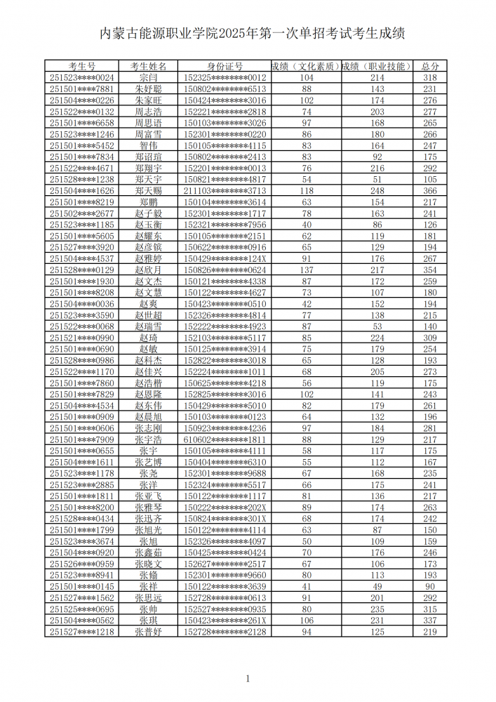 内蒙古能源职业学院2025年第一次单独招生考试成绩-内蒙古能源职业学院