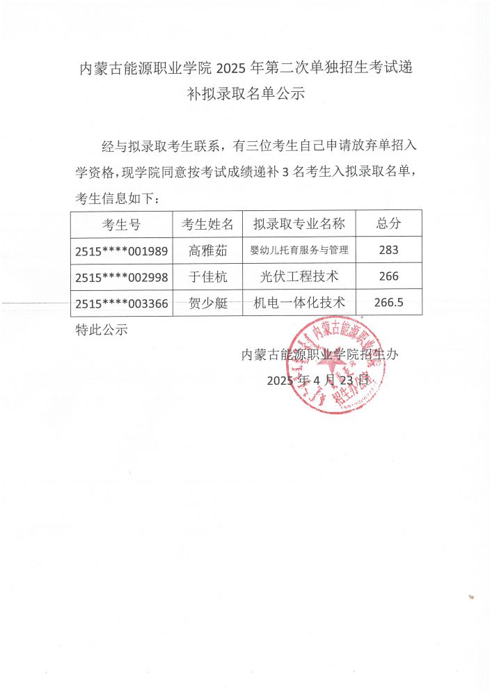 内蒙古能源职业学院2025年第二次单独招生考试递补拟录取名单公示