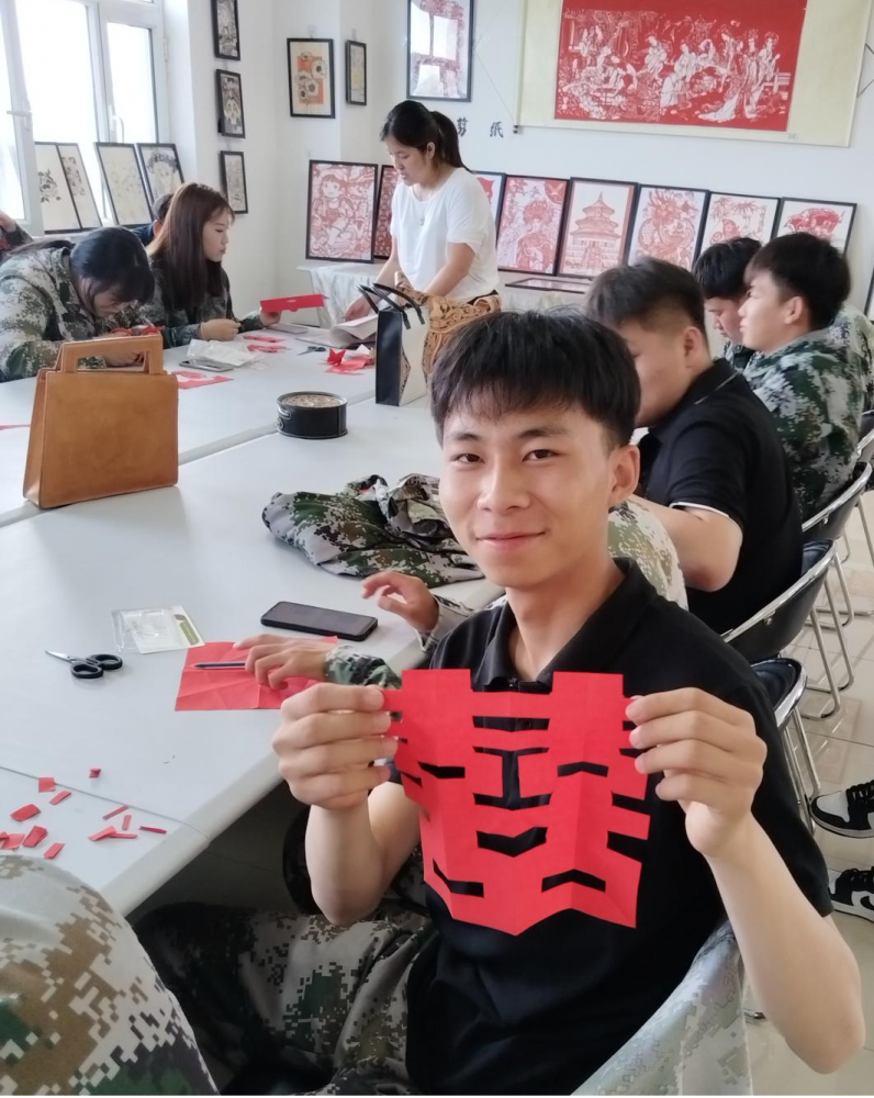 课上,皮雕与剪纸非遗传承人张慧敏老师为学生们详细讲解了皮雕与剪纸的历史渊源,工艺特点以及文化内涵。在皮雕展示环节,展示了其精湛的技艺,从皮革的挑选,图案的设计,到工具的使用和制作技巧,让同学们深刻感受到了皮雕艺术的独特魅力。在剪纸环节,张老师详细讲解了剪纸的基本技巧,包括选纸、握剪刀、构思图案和下剪等。学生们在指导下,纷纷拿起剪刀剪出自己的作品,体现了学生对传统文化的热爱。思政课教师陈月红以“剪纸里的中国,非遗传承与文化自信”为主题,将非遗文化与思政教育深度融合开展思政课教学,让学生们深刻体会到了传统文化的魅力,增强文化自信,弘扬中华优秀传统文化。