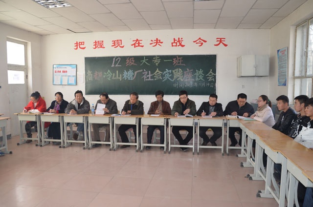2013年11月14日下午,我院举行了12级大专一班商都冷山糖厂社会实践座谈会,院党总支书记兼副院长高忠厚,副院长闫永平及各处室领导参加了会议。 会上,同学们纷纷对商都冷山糖厂社会实践活动发表了感想,表示虽然此次社会实践比较艰苦,困难很多,但给自身带来的收益却颇丰,不仅巩固了课堂所学的知识,更锻炼了团队合作、独自解决问题的能力,也学会了如何待人处事,体会到父母的不容易。 院领导对此次...