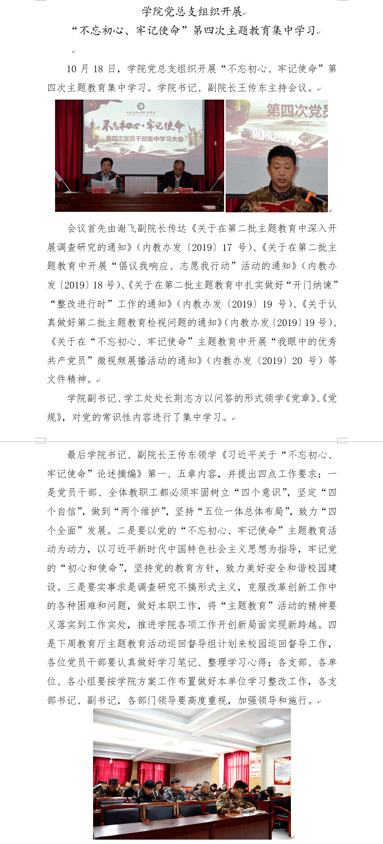 党的十九大精神以来,特别是党的十九届一中、二中、三中全会以来,内蒙古能源职业学院党总支深入开展各类教育活动,把党员教育作为深入贯彻党的十九大精神的重要抓手,通过“三学”方式,让学习十九大精神达到“三进”,成为自治区民办高校“打造立德树人新校园,建立自信包容大课堂”的一块招牌,助推各项工作不断取得新进展、新成效,各项工作展开新局面。通过原原本本系统学,在学习领会中提升工作标准。党总支一班人带头深入...