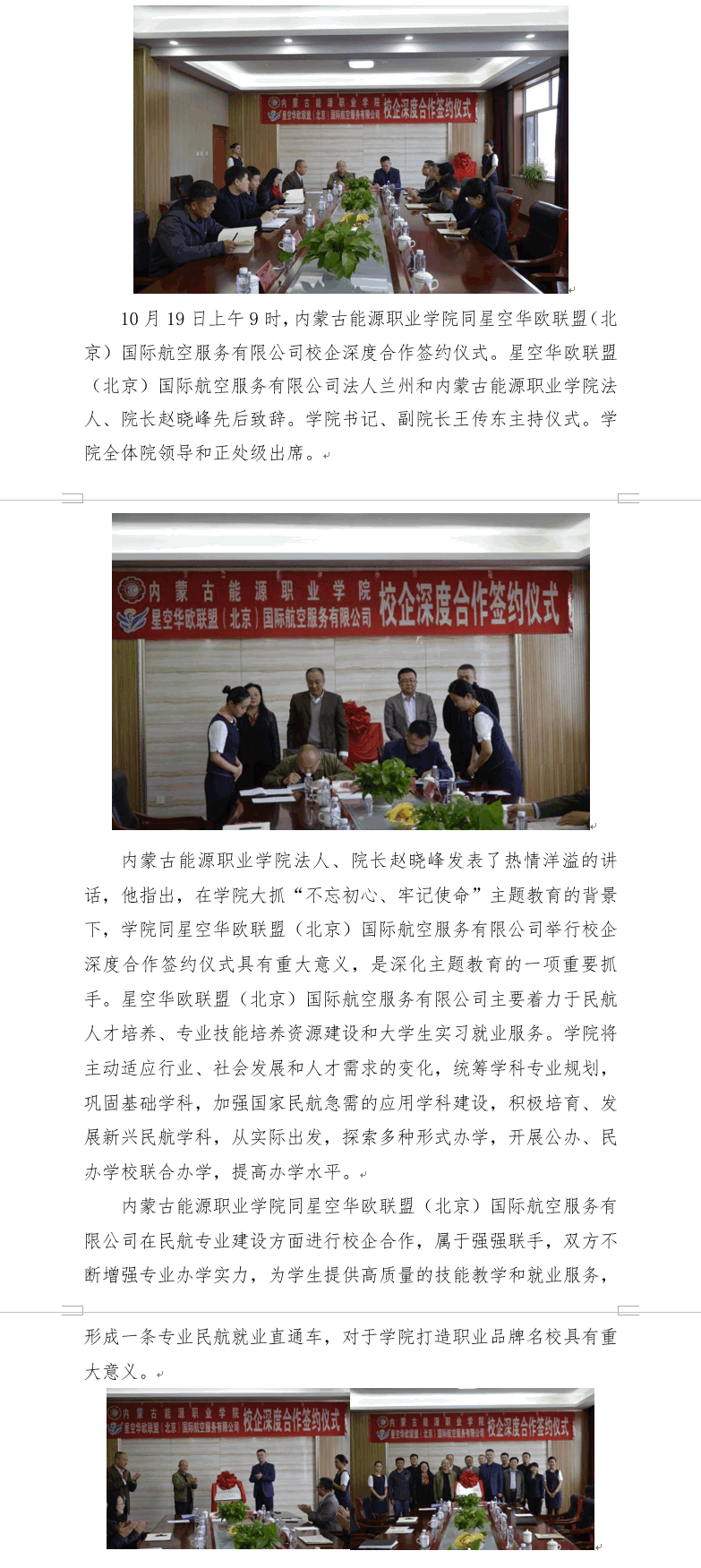 一、 时间:2019年10月19日上午9:00二、 地点:八一楼二楼会议室三三、 主持人:王传东四、 与会人员:星空华欧(北京)国际航空服务有限公司代表团内蒙古能源职业学院处级以上领导五、 议程:第一项 主持人致欢迎词第二项 星空华欧(北京)国际航空服务有限公司代表发言第三项 赵晓峰院长讲话第四项 签约第五项 揭牌第六项 合影...